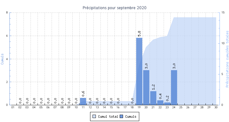 | 14 | 8.6 °C à 06:53 | 15.8 °C à 15:32 | 11.1 °C | 11.6 km/h (35.4 km/h) | 69 |