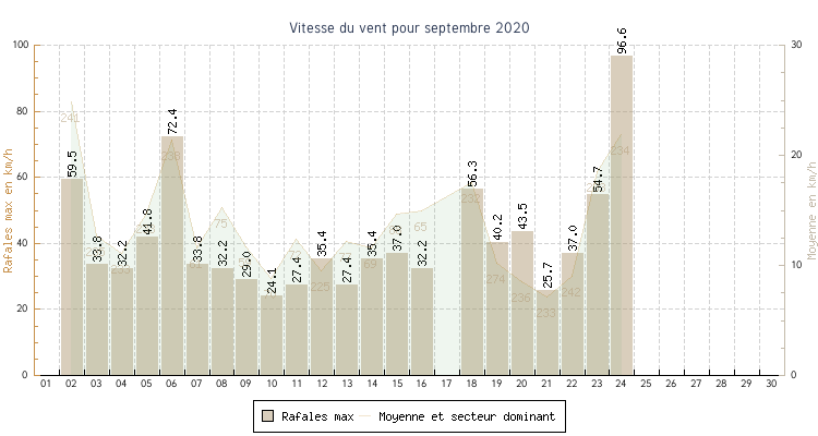| 24 | 2.4 °C à 20:34 | 6.7 °C à 15:39 | 4.1 °C | 21.9 km/h (96.6 km/h) | 234 |